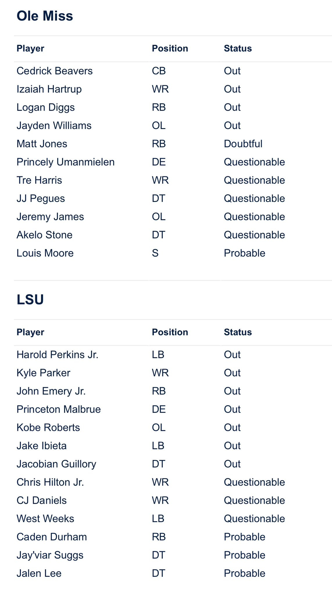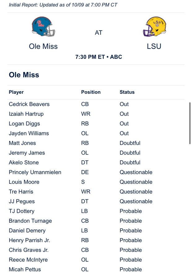 Thursday night’s updated injury report saw Ole Miss’ number of players listed shrink to 11. Luis Moore was upgraded from questionable to probable, and every single player listed as probable on Wednesday’s report was removed altogether. So, what should you make of this report each week in terms of the accuracy of it? I don’t have a definitive answer. I just focus on who is listed as questionable. From there, your guess is as good as mine as to whether those listed as such end up playing in the game.